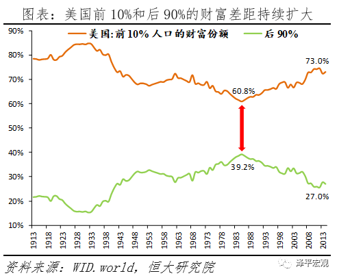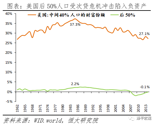 美国财富分配差距持续扩大。2014年,美国前1%的人口拥有38.6%的总财富,前10%的人口拥有73.0%的总财富;而前者在1980年的占比为22.5%,后者在1985年的占比为60.8%。2014年,后50%的人口仅拥有-0.1%的总财富,中间40%的人口拥有27.1%的总财富;后50%的人口受次贷危机冲击陷入负资产,中间40%人口的财富份额亦快速下降。