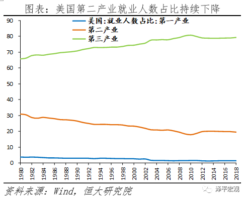美国制造业持续外流。2001年中国加入WTO,依靠物美价廉的产品迅速抢占国际市场。美国制造业增加值占全球比重由2001年的28.3%快速下滑至2017年的16.7%,中国则从2004年的8.7%快速上升至2017年的27.1%。中国于2010年超过美国,成为世界第一制造大国。