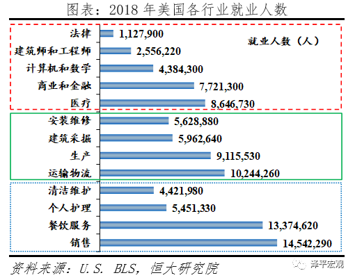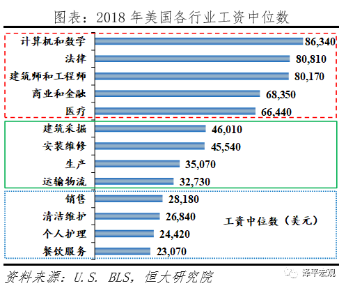 制造业岗位流失冲击蓝领工人就业。美国中产阶级的崛起依赖于制造业大发展,制造业提供了大量相对高薪且稳定的工作岗位,1913年福特汽车公司的流水线工人便是最典型的例子。因此受制造业萎缩冲击最大的就是这些蓝领中产工人。2018年美国薪资最高的是计算机、法律、金融和医疗等高端服务业,接下来是制造业,最低的则是餐饮等低端服务业。高端服务业的就业岗位有限、职业技能要求较高,因此制造业工人往往只能向低端服务业转移,收入下降且岗位不稳定。