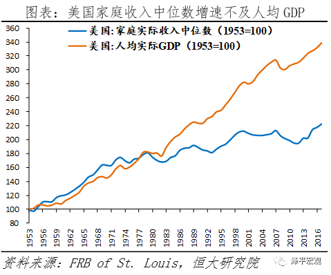 中产阶级收入增长停滞。美国第二产业就业人数占比持续下降,第三产业占比上升。产业结构和就业结构变化带来收入分配上的变化。美国人均实际GDP平稳上升,1953-2017年间增长了238.9%;但是家庭实际收入的中位数却只增长了122.2%,尤其是1980年之后,收入增速显著放缓。经济增长的成果集中流向高收入阶层,而未惠及广大的中产阶级。