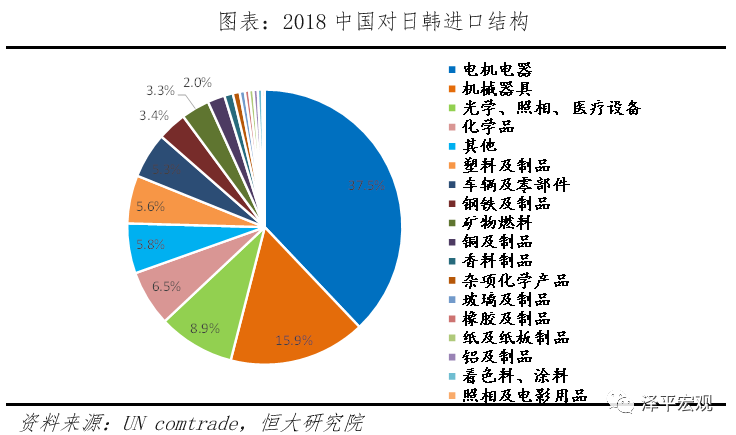 日韩方面,2018年日本和韩国贸易总额在全球占比分别为3.8%、2.9%,中国是日韩第一大出口国。从产品大类来看,中国对日韩出口最多的产品有机电产品(电机电器、机械器具)、劳动密集型产品(服装、家具、塑料、玩具)、医疗设备和化学品等,中国向日韩进口最多的产品为机电产品、医疗设备、化学品和塑料,其中,来自日、韩进口机电产品分别占自日、韩进口总额的45.5%和60.3%。从细分来看,我国对日本工业机器人、点蓄电池、汽车(带有火花点火式)、车辆齿轮箱等高度依赖,从日本进口占该零部件总进口额的62.9%、72.2%、88.9%、42.4%。我国对韩国电子集成电路和微装置高度依赖,从韩国进口占该零部件进口总额40%。日韩疫情恶化将造成全球半导体原材料短缺、核心零部件短缺、制造成本上升等主要冲击,中国作为全球半导体材料和设备重要采购国,将受到直接影响。