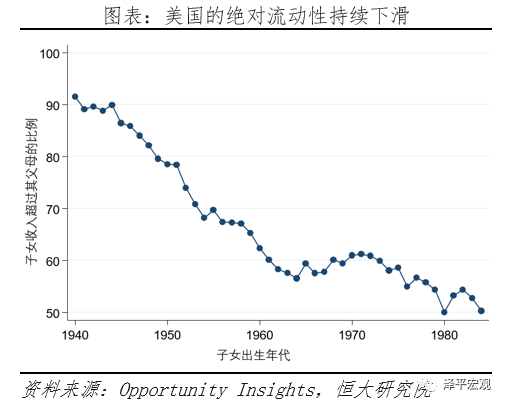 美国梦的核心是:每一代人都比上一代人收入更高、生活更好,只要肯努力,就有希望实现阶层跃升,跻身中产阶级。上升通道是否顺畅、阶层是否固化可用“绝对流动性”这一指标来衡量:全社会子女30岁时收入超过其父母30岁时收入的比例。比例越高,说明下一代人实现阶层跃升的希望越大。