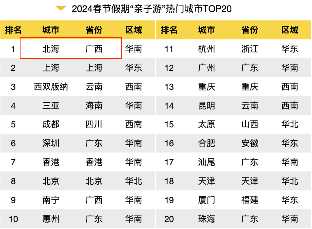 春节假期结束,北海飙升为2024春节“亲子游”热门城市第一名!涠洲岛以独特海岛魅力,同时成为2024年春节“亲子游”热门景点的榜首!